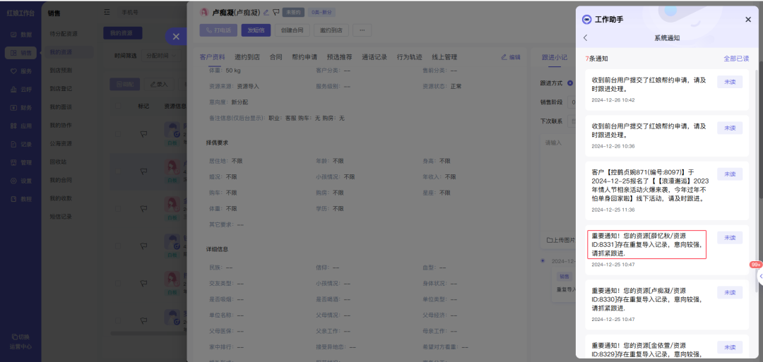 重复导入的问题处理,提醒红娘对重复资源的及时跟进,确保有意向的客户不流失。在公海的,将资源放入待分配列表,店长重新分配