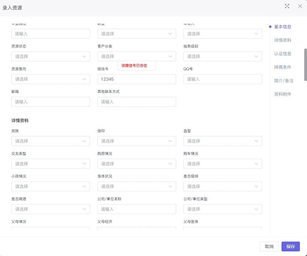 运营录入,微信号检测重复性,微信号重复将无法录入,便于运营人员提醒所属红娘加强跟进。